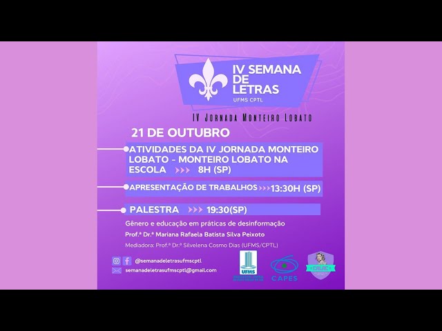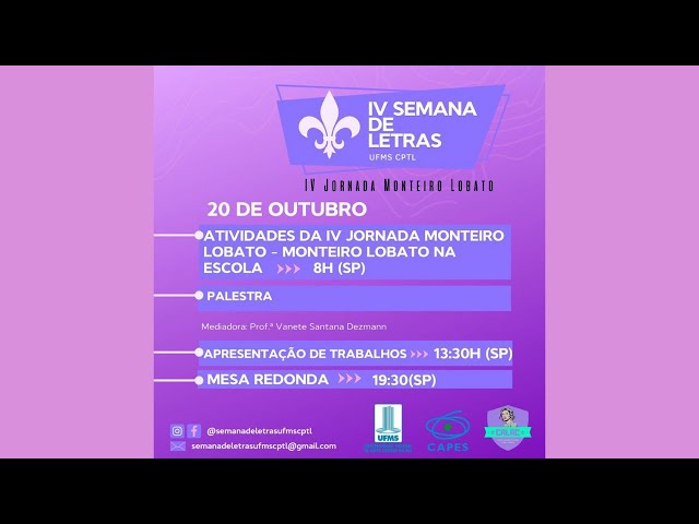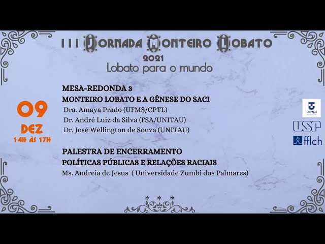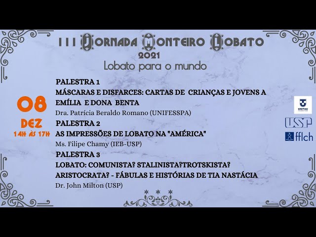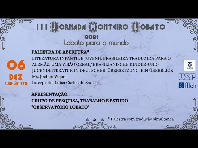 III Jornada Monteiro Lobato - 2021 Primeiro dia - 06/12/2021 Segundo dia - 07/12/2021 Terceiro dia - 08/12/2021 Quarto dia - 09/12/2021 IV Jornada Monteiro Lobato - 2022 Primeiro dia - 20/10/2022 Segundo dia - 20-10/2022 Terceiro dia - 21/10/2022